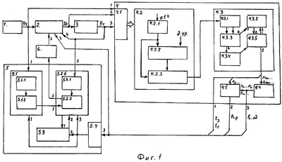 При появлении ощутимой ошибки регулирования, обусловленной изменением сигнала задания или появлением новых возмущающих воздействий, CAP начинает поиск нового алгоритма регулирования. При этом идентификатор 4 с достаточной точностью и быстродействием обеспечивает нахождение параметров объекта и всей CAP в целом. Определитель регулятора, входящий в идентификатор, учитывая внутренние параметры объекта и внутренние параметры необходимой системы, определяет структуру регулятора. По этой структуре формирователь показательной ф. 5 корректирует постоянные интегрирования и при необходимости вводит дополнительное вынужденное состояние (корни которого равны корням слагаемых свободного состояния объекта), позволяющее скорректировать текущее значение коэффициентов свободного состояния объекта.