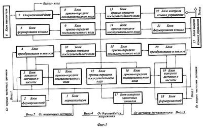 Входы блока 2 формирователей и блока 3 контроля датчиков и частоты соединены между собой и с первым входом системы от первых частотных датчиков, вход блока 1 нормализаторов соединен со вторым входом системы от аналоговых датчиков, выход блока 2 формирователей соединен с блоком 3 контроля датчиков и частоты и блоком 5 преобразования и анализа, вход которого соединен с выходом блока 3 контроля датчиков и частоты, выход блока 1 нормализаторов соединен с блоком 3 контроля датчиков и частоты и блоком 4 преобразования и анализа, вход-выход которого соединен со входом-выходом блока 10 приема-передачи последовательного кода, вход-выход блока 3 контроля датчиков и частоты соединен со входом-выходом блока 11 приема-передачи последовательного кода, вход-выход блока 17 контроля одиночных сигналов соединен со входом-выходом блока 12 приема-передачи последовательного кода, вход-выход блока 6 накопителя соединен со входом-выходом операционного блока 7, второй вход-выход операционного блока 7 соединен со входом-выходом блока 8 приема-передачи последовательного кода, а третий вход-выход операционного блока 7 соединен с выходом системы, входы блока 18 формирователей и блока 19 контроля датчиков и частоты соединены между собой и с третьим входом системы от вторых частотных датчиков, выход блока 18 формирователей соединен с блоком 19 контроля датчиков и частоты и блоком 20 преобразования и анализа, вход которого соединен с выходом блока 19 контроля датчиков и частоты, выход блока 1 нормализаторов также соединен с блоком 19 контроля датчиков и частоты и блоком 20 преобразования и анализа, вход-выход которого соединен со входом-выходом блока 15 приема-передачи последовательного кода, вход-выход блока 19 контроля датчиков и частоты соединен со входом-выходом блока 16 приема-передачи последовательного кода, вход-выход блока 5 формирования команд соединен со входом-выходом блока 9 приема-передачи последовательного кода, вход-выход блока 21 формирования команд соединен со входом-выходом блока 14 приема-передачи последовательного кода, выходы блока 5 и 21 формирования команд соединены с блоком 23 выдачи команд управления, выход которого соединен с выходом системы, а через блок 22 контроля команд управления соединен с блоком 13 приема-передачи последовательного кода, вторые входы-выходы блоков 8, 9, 10, 11, 12, 13, 14, 15 и 16 приема-передачи последовательного кода соединены между собой, блок 17 контроля одиночных сигналов соединен с пятым входом системы от датчиков-сигнализаторов и с четвертым входом от бортовой сети напряжения.