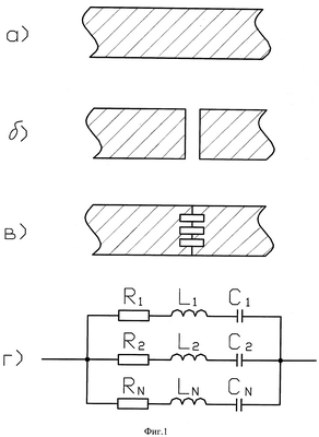 На фиг. 1(а-г) показаны три состояния электрических проводников (в том числе и печатных) и контактных подключений: исправное (фиг.1а), отказное в виде обрыва (фиг.1б), сбойное (фиг.1в), а также эквивалентная электрическая схема сбойного состояния (фиг.1г). В общем случае схема сбойного состояния представляет собой “N” параллельно включенных микрорезонансных контуров с параметрами Ri, Li, Сi, (Li=1, 2, …, N), где Ri, Li – соответственно распределение омическая и индуктивная составляющие, а Сi – образованная при скрытых дефектах емкостная составляющая. Для ряда случаев и, в первую очередь, при работе автомобильных датчиков в области низких, инфранизких частот, а также при работе на постоянном токе (т.е. практически на нулевой частоте) предлагаемое решение показано на примере определения сбоя датчика температуры охлаждающей жидкости (ДТОЖ).