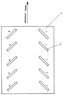 На чертеже представлена диэлектрическая пластина 1 с двумя параллельными рядами электродов 2, причем электроды одного ряда подключены к положительному полюсу выпрямителя и расположены под углом к электродам другого ряда, подключенным к отрицательному полюсу выпрямителя.
