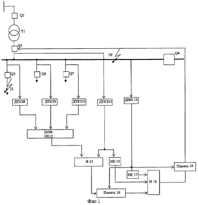 Схема (см. фиг.1) содержит питающий трансформатор Т1, вводной выключатель Q2 на стороне высокого напряжения, вводной выключатель Q3 на стороне низкого напряжения, выключатель АВР Q4, выключатель в отходящей линии Q5, выключатель в отходящей линии Q6, выключатель в отходящей линии Q7, датчик тока короткого замыкания ДТКЗ 8, датчик тока короткого замыкания ДТКЗ 9, датчик тока короткого замыкания ДТКЗ 10, датчик тока короткого замыкания ДТКЗ 11, элемент ИЛИ-НЕ12, элемент И 13, датчик наличия напряжения ДНН 14, элемент НЕ15, элемент Память 16, элемент НЕ17, элемент И 18, элемент Память 19, точка короткого замыкания 20, точка короткого замыкания 21.