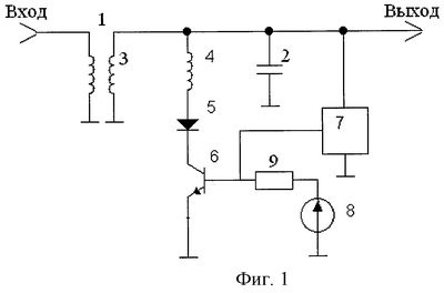 Необходимо также обеспечить оптимальный режим коммутации при таких условиях: уменьшение индуктивности обеспечить при максимальном значении тока iC, а переход в исходное состояние при iC=0. В этом случае коммутационные потери минимальны. Это обеспечивается при выполнении условия Е=Е’, т.е. напряжение смещения на базе транзистора 6 равняется напряжению отсечки транзистора. Для транзистора типа n-р-n (фиг.1) напряжение отсечки Е’=0.5…0.7 В (кремниевый транзистор) или 0.2…0.3 В (германиевый транзистор). Заданное напряжение смещения устанавливается источником напряжения смещения 8. На режим коммутации влияют также характеристики интегрирующей цепи 7, величина создаваемого фазового сдвига и значение амплитуды сигнала на ее выходе. Идеальный интегратор создает фазовый сдвиг и=90°. Однако в реальной схеме это требование с высокой точностью реализовать нет необходимости, поскольку в моменты коммутации iС меняется медленно. Поэтому в качестве интегрирующей цепи 7 можно использовать как простейшие RC и LR цепи, так и активные звенья. При этом должны выполняться условия Тu>Т, где Тu – постоянная времени интегрирующей цепи, Т – период входного ВЧ-сигнала.