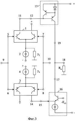 С другой стороны, выходной ток i14 передается через каскад с общей базой 16 и создает в нагрузке Rн составляющую i17, которая противоположна по направлению составляющей i19