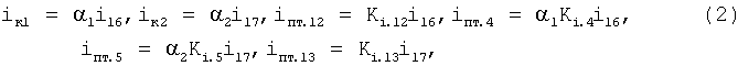 Эти приращения токов i16, i17, которые равны соответствующим приращениям токов эмиттеров транзисторов 1, 2, передаются, с одной стороны, на входы 6 и 7 и выходы 8, 9 токовых зеркал 4 и 5, а с другой – на входы 20 и 11, а затем выходы 10, 21 токовых зеркал 12 и 13: