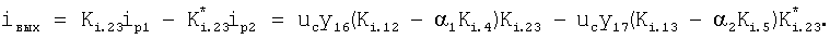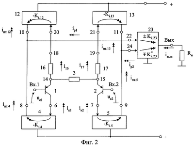 Отличие коэффициентов передач по току Ki.12 и Кi.13, Ki.4 и Кi.5 обусловлено в реальных схемах неодинаковыми значениями применяемых р-n-р (12, 13) и n-p-n (4, 5) транзисторов, а также неодинаковыми значениями их статического режима по напряжению коллектор-база. Именно эти причины приводят к появлению токовых ошибок ip1 и ip2, которые поступают на входы 22 и 24 дополнительного сумматора 23. Однако входные токи ip1=ip2 дополнительного усилителя 23 будут иметь почти одинаковые значения, т.к. токовые зеркала 4 и 5, а также 12 и 13 попарно идентичны.