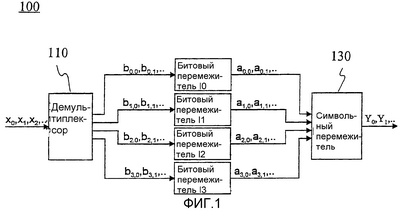 Битовое перемежение (и последующее символьное перемежение) основано на блоках и выполняется только в отношении полезных данных (полезной нагрузки). Каждый подпоток из демультиплексора 110 обрабатывается отдельным битовым перемежителем с помощью последовательности перемежения, которая определена отдельно для каждого битового перемежителя. Подпоток b0,0, b0,1,… передается к первому битовому перемежителю I0. Подпоток b1,0, b1,1,… передается ко второму битовому перемежителю I1. Подпоток b2,0, b2,1,… передается к третьему битовому перемежителю I2, а подпоток b3,0, b3,1,… передается к четвертому битовому перемежителю I3. Используемый размер блока в битовом перемежении равняется 126 битам. Поэтому каждый подпоток b0,0, b0,1,…, b1,0, b1,1,…, b2,0, b2,1,… и b3,0, b3,1,… состоит из 126 битов.