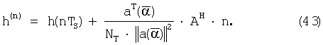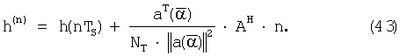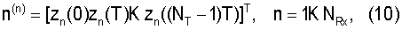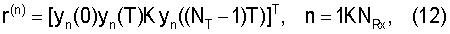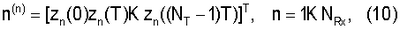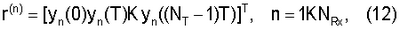 Поскольку выходные сигналы y(t) дискретизируются с частотой дискретизации 1/Т, векторы, содержащие дискретные по времени отсчеты, могут представлять сегменты конечной длительности непрерывных по времени сигналов. Для простоты принятые сигналы y(t) описываются здесь дискретным во времени представлением на конечном интервале времени t=0, T, K, (NT-1)T, где NT есть число отсчетов, взятых по времени. Поэтому используются нижеследующие аббревиатуры. Каждый дискретный во времени переданный сигнал в антенне n, задержанный на , задается вектором