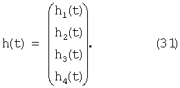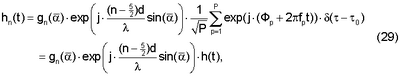 Четыре (4) канальных импульсных отклика от антенн передатчика Тх являются тогда копиями канального импульсного отклика h(t), взвешенными четырьмя комплексными коэффициентами, что означает, что вектор h(t) является линейным преобразованием скаляра h(t), заданного уравнением