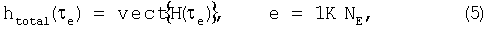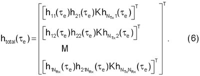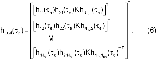 Вектор htotal( e) размером ((NTx·NRx)×1) состоит из элементов матрицы H(t), взятых в качестве отсчетов в момент e, со всеми столбцами H( e), расположенными на верху друг друга в векторе htotal( e), что обозначается оператором vect{H( e)} в уравнении (5), т.е. htotal( e) задается уравнением