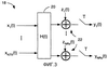 Фиг.3 иллюстрирует модель 18 канала МнМн для непрерывного времени, имеющего линейный фильтр 20 МнМн с NTx входами и NRx выходами. Линейный фильтр 20 МнМн определяется матрицей H(t) размером NTx×NRx, состоящей из линейных функций hij(t), i=1…NTx, j=1…NRx. В общем случае hij(t), i=1…NTx, j=1…NRx являются неизвестными линейными функциями. Линейный фильтр 20 МнМн представляет (NTx·NRx) радиоканалов, через которые NTx переданных сигналов проходят к NRx приемным антеннам. Эти радиоканалы характеризуются их канальными импульсными откликами hij(t), i=1…NTx, j=1…NRx. Входной сигнал x(t) для модели представляет собой вектор столбца (NTx×1), представляющий NTx ограниченных по полосе передаваемых сигналов, а выходной сигнал y(t) для модели является вектором столбца (NRx×1), дискретизированного в моменты t=T, 2T…, как показано ключом Т, когда ширина полосы передаваемого сигнала меньше или равна 1/Т. Принятые сигналы содержат дополнительные сигналы возмущений, представленные вектором z(t) столбца NRx×1, введенным вследствие шума или интерференции от соседнего канала. Дополнительные сигналы возмущений суммируются в узлах 22 суммирования. Отношение между входными сигналами x(t), каналами H(t), возмущением z(t) и выходными сигналами y(t) задается уравнением: