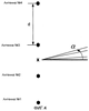 Фиг.4 иллюстрирует физическую конфигурацию антенн в передатчике примерного варианта выполнения, смоделированного, как на фиг.2. Способ сниженного ранга применяется, чтобы оценивать линию, представленную канальной моделью 14 и имеющую передатчик 12, выполненный с четырьмя (4) антеннами, разнесенными каждая на расстояние “d”. Конкретика конфигурации и модели обсуждаются здесь ниже. Отметим, что процедура оценки выполняется в приемнике 16. Опорное направление задается горизонтальной линией. Углы передачи измеряются относительно этого опорного направления. Угол “ ” соответствует углу тракта распространения по отношению к этой опоре в двумерной плоскости, как иллюстрируется. Показан также диапазон углов по отношению к опорному направлению. Для оценки линии в приемнике 16 в системе 10 используется следующий способ.
