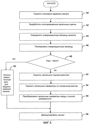 Оцениваемая ковариационная матрица Rh ранжируется затем на шаге 46, что означает, что оценивается число доминантных собственных векторов. Этот ранг сравнивается с максимальным значением “МАХ” на шаге 48. Значение МАХ равно общему числу оцененных канальных параметров в векторе h. Иными словами, МАХ равно (NTx·NRx·NE). Поскольку многие механизмы, влияющие на корреляцию, такие как направленность трактов распространения, не изменяются быстро во времени, корреляционные характеристики могут быть оценены путем усреднения по достаточно длинным временным интервалам по сравнению с обратной величиной от частоты фединга в канале(-ах).
