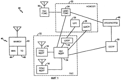 В предпочтительных вариантах осуществления настоящего изобретения смешанная система сотовой связи ГСМС/МДКР включает в себя как базовые станции МДВР, так и базовые станции МДКР, которые управляются совместно центром коммутации мобильной связи (ЦКМС). В общих чертах системы этого типа описаны в вышеупомянутых заявках РСТ, которые включены в данный документ посредством ссылок. Абонентское устройство в рассматриваемой системе, также называемое здесь мобильной станцией (МС), способно осуществлять связь с обоими типами базовых станций посредством своевременного переключения между радиоинтерфейсами МДВР и МДКР при предпочтительном использовании сетевых протоколов ГСМС для обоих типов интерфейсов. Отличительным признаком предпочтительных вариантов осуществления настоящего изобретения является то, что рассматриваемая система связи может основываться на уже существующей инфраструктуре ГСМС/МДВР с добавлением базовых станций МДКР и без других существенных модификаций существующей инфрастуктуры, что существенно.