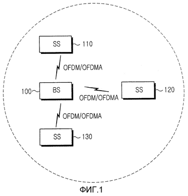 На Фиг. 1 представлена структурная схема, иллюстрирующая широкополосную систему связи с беспроводным доступом, с использованием схемы OFDM/OFDMA (МОЧР/МДОЧР, мультиплексирование с ортогональным частотным разделением/множественный доступ с ортогональным частотным разделением). Более конкретно, на Фиг. 1 показана система связи в соответствии со спецификациями IEEE 802.16a/IEEE 802.16e.