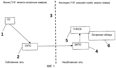 Заявитель рассматривает специальный случай, когда финский пользователь выполняет роуминг в Японию и набирает экстренный номер, действующий в Японии, 118, для установления экстренного сеанса связи. Как упомянуто выше, этот номер является экстренным номером в Японии, но является номером службы в Финляндии. В этом случае ПО 1, имеющее подписку (например, МПIP) из Финляндии, не может обнаружить, что набранный номер является экстренным номером. Без использования изобретения П-ФУСВ 5 также не могла бы обнаружить попытку экстренного вызова, поскольку 118 не мог бы быть запомненным без дополнительной связанной информации местоположения как экстренный номер/УАР в конфигурируемом списке (иначе было бы невозможно вызывать запрос номера в Финляндии).