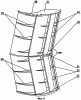 6. Распорная траловая доска, содержащая нижнее крыло, верхнее крыло и, по меньшей мере, одно промежуточное крыло, причем крылья изогнуты в направлении перемещения распорной траловой доски в воде с образованием между собой каналов, а также параллельно ориентированные продольные ребра и киль, при этом крылья выполнены с различным удлинением, расположены ступенчато друг над другом с разными межкрыловыми промежутками и образуют относительно центрального продольного ребра V-образный профиль, отличающаяся тем, что крылья имеют аэродинамический профиль с максимальным профилем верхнего крыла, составляющим 18% от длины крыла, и соотношением длины крыльев к их ширине, составляющем от 1:1,3 до 10,3, передние кромки крыльев укреплены стрингерами, угол V-образного профиля выполнен с равными плечами и составляет 155°, по меньшей мере, четыре дополнительных направляющих ребра-стабилизатора установлены вдоль всей длины траловой доски.