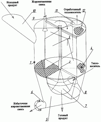 Затем предварительно нагретая жировитаминная смесь подается в форсунку 9, которая обеспечивает мелкодиспергированное распыливание жировитаминной смеси над всей поверхностью слоя экструдированных гранул. Жировитаминная смесь осаждается на поверхности гранул, которые из-за невысокой начальной влажности (5…7%) имеют очень развитую микропористую структуру, и впитывается ими. Количество жировитаминной смеси, подаваемой для нанесения на поверхность экструдированных гранул, выбирают с учетом технологических требований к качеству готового продукта. По достижении определенной степени готовности гранул подача жировитаминной смеси в форсунку 9 прекращается. Избыток жировитаминной смеси стекает с поверхности гранул, просачивается сквозь сетчатую перегородку первой секции, поступает в патрубок 6 и снова направляется в форсунку 9.