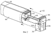 Верхняя направляющая 44 предпочтительно представляет собой алюминиевую штамповку, имеющую постоянное поперечное сечение с плоской верхней 46 и задней 48 стенками и с закругленной передней стенкой 50. На одном конце верхней направляющей 44 размещается верхний раздвижной узел 52, а ее противоположный конец закупорен зажимом 54, имеющим нескользящую прокладку 56, прилегающую к наружной поверхности. Одна сторона зажима 54 имеет поперечное сечение, размеры которого совместимы с верхней направляющей 44 при прессовой посадке. Зажим 54 имеет также отходящую вниз лапку 55, которая входит в зацепление с внутренней поверхностью поперечного элемента 57 стенового косяка 28. Зажим 54 и верхний раздвижной узел 52 закрываются соответствующими колпачками 58 и 60, перекрывающими концы верхней направляющей 44. Как показано на фиг.2, колпачки 58 и 60 можно сдвигать внутрь по верхней направляющей 44 для получения доступа к деталям, находящимся на концах верхней направляющей 44.