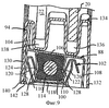 Элемент жесткости 102 пропущен под нижним раздвижным узлом 96 и внутренними концами опорных направляющих 86 и 88, где он взаимодействует с внутренними стенками 110 для предотвращения изгибания и скручивания опорного узла 26. Элемент жесткости 102 имеет в общем плоское дно 118 с передней 120 и задней 122 вертикальными стенками, имеющими простирающиеся вниз и внутрь кромки 124 и 126 соответственно, обжатые вокруг буртиков 128 внутренних стенок 110, так что его можно надеть на концы опорных направляющих 86 и 88. Элемент жесткости 102 можно сдвигать относительно внутренних стенок 110 (и, таким образом, опорных направляющих 86 и 88) так, как нужно, в процессе регулировки ширины опорного узла 26.