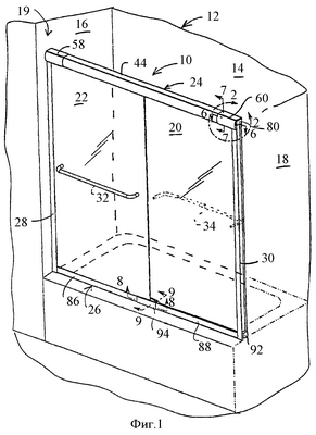 Как показано на фиг.1, настоящее изобретение предлагает раздвижную душевую дверную систему 10, предназначенную для кабин 12 душей и ванн, ограниченных задней стенкой 14 и противоположными торцевыми стенками 16 и 18 с проемом 9 между ними. Душевая дверная система 10 включает в себя в качестве основных элементов две стеклянные дверные панели 20 и 22, узел перемычки 24, опорный узел 26 и вертикальные стеновые косяки 28 и 30. Уникальную систему можно отрегулировать таким образом, чтобы она подходила к проемам в кабине, имеющим различные размеры, без необходимости обрезания одного или нескольких ее элементов. Кроме того, систему можно надежно прикрепить к душевой кабине, не повредив при этом стыкуемых стенок кабины.