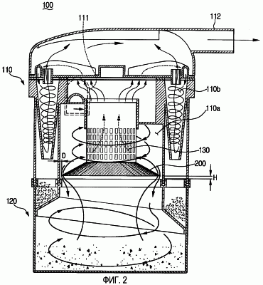 Согласно предпочтительному варианту осуществления настоящего изобретения пылеулавливание является оптимальным, когда расстояние D между элементом для предотвращения противотока загрязняющих частиц 200 и корпусом 110 циклона составляет приблизительно 10-12 мм, а высота Н элемента для предотвращения противотока загрязняющих частиц 200 от сборника загрязняющих частиц 120 составляет приблизительно 8 – 10 мм.