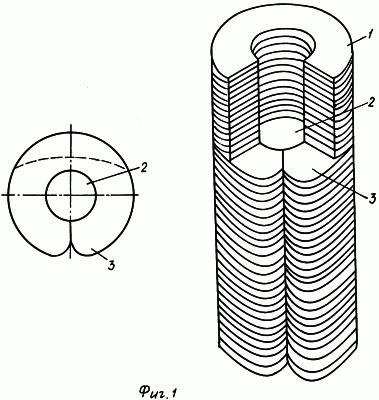 Сущность изобретения поясняется иллюстрациями, где на фиг.1 представлен продольно-поперечный и поперечный разрезы устройства, выполненного из сплошного эластичного материала в виде трубки, наружная поверхность которого путем нарезки превращена в набор подковообразных элементов 1; внутри устройства имеется полость 2 по всей длине изделия; свободные концы подковообразных элементов (лепестки 3) свободно отжимаются. Наружный размер массажера 20 мм, внутренний 8 мм, высота элемента 1,5 мм. Наружные и внутренние края имеют плавные очертания. На фиг.2 представлена фотография, на которой изображен базис с искусственными зубами и установленным на нем предлагаемым устройством. На фиг.3 представлена фотография устройства в работе.
