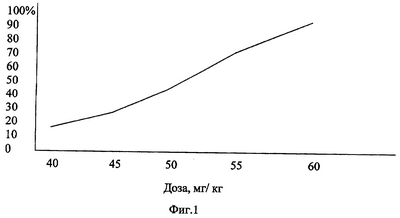 На основе данных антиаритмичного действия (табл.3, 4; фиг.3, 4) при аконитиновой аритмии и показателей острой токсичности препаратов (ЛД50), которые изучались, проведен расчет среднеэффективной дозы (ЕД50) амиодарона и препарата тиодарон. Они составляли соответственно 37,6±3,6 и 29,2±3,3 мг/кг массы животных, а терапевтический индекс (ТИ) соответственно 128,0 и 182,0.