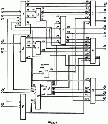На фиг.1 показаны первый 21, второй 22 и третий 23 информационные входы системы, первый 24, второй 25 и третий 26 синхронизирующие входы системы, а также адресный 31 и информационный 32 выходы системы, первый 33 и второй 34 синхронизирующие выходы системы, информационные выходы 35-37 группы системы, первый 38 и второй 39 сигнальные выходы системы.