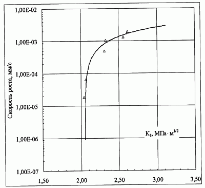 По фактическим параметрам испытания и геометрическим размерам трещин (длина трещин – 8 мм принята равной длине участка приложения нагрузки к трубчатому образцу) была рассчитана средняя скорость роста трещин и в соответствии с методикой (Stress-intensity factors for internal surface cracks in cylindrical pressure vessels. Newman J.C., Raju I.S. / Trans. ASME, Ser. J, J. Pressure Vessel Technol., 1980, Vol.102, P.342-346.) рассчитан начальный коэффициент интенсивности напряжения. По полученным результатам построена зависимость средней скорости роста трещины от начального коэффициента интенсивности напряжения, приведенная на чертеже, и определен пороговый коэффициент интенсивности напряжения, равный 2 МПа·м1/2. Полученный результат совпадает с результатом, полученным для сплава Э110 по способу-прототипу (Influence of irradiation on KISCC of Zr – 1% Nb claddings. Bibilashvili Yu.K., Medvedev A.V., Nesterov B.I., Novikov V.V., Golovanov V.N., Eremin S.G., Yurtchenko A.L. / Journal of Nuclear Materials, 2000, Vol.280, P.106-110), что подтверждает достоверность получаемого с помощью предлагаемого способа значения порогового коэффициента интенсивности напряжения. При этом результат получен при значительном (3,5 млн руб.) сокращении затрат и времени на проведение испытаний (на один год).