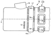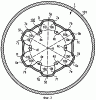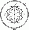 Представленный на Фигуре 7 четвертый вариант устройства отклонения потока 1d содержит в своей боковой поверхности возвышение 17, проходящее кольцееобразно вокруг аксиального направления, а также несколько возвышений, которые образуют кольцееобразное возвышение 17а с прерываниями. На боковых сторонах возвышений 17, 17а расположены отверстия истечения 19a, b, c, d, e, f. Направления истечения отверстий истечения 19а, b, с, d, e, f проходят в аксиальном направлении, причем направления истечения соответственно сопоставленных друг с другом отверстий истечения 19a, f; 19b, e; 19с, d пересекаются. В видоизмененных формах для достижения одинакового действия вместо возвышений на направлении оттока 1d могут быть предусмотрены углубления или отверстия истечения могут быть ориентированы под углом к окружающей их поверхности.