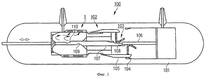Представленный на Фигуре 1 силовой выключатель 100 содержит герметизирующий корпус 101. Герметизирующий корпус 101 может быть изготовлен из электрически проводящего материала или из электрически изолирующего материала. Внутри герметизирующего корпуса 101 расположен размыкающий блок 102 силового выключателя 100. Герметизирующий корпус 101 заполнен изолирующим газом, например SF6. Размыкающий блок 102 содержит контактный узел 103. Контактный узел 103 содержит неподвижный контакт номинального тока 104 и подвижный контакт номинального тока 105. Кроме того, предусмотрены неподвижный дугогасительный контакт 106 и подвижный дугогасительный контакт 107. Как подвижный контакт номинального тока 105, так и подвижный дугогасительный контакт 107 являются подвижными в аксиальном направлении. Нижняя половина Фигуры 1 показывает контактный узел 103 во включенном состоянии, верхняя половина Фигуры 1 показывает контактный узел 103 во время процесса выключения. Подвижный дугогасительный контакт 107 выполнен трубчатым, так что в процессе выключения возникающий посредством горящей при известных обстоятельствах электрической дуги 108 дугогасящий газ внутри подвижного дугогасительного контакта 107 может отводиться от раствора контактов контактного узла 103. На обращенном от контактного узла 103 конце подвижного дугогасительного контакта 107 предусмотрены выходные отверстия 109, 110, из которых дугогасящий газ может выступать в пространство, которое окружено устройством направления потока 1. Расположение устройства направления потока 1 не ограничено областью обращенного к контактному узлу 103 конца подвижного дугогасительного контакта 107. Подобное устройство направления потока 1 может альтернативно или дополнительно предусматриваться также в области неподвижного контакта номинального тока 104, чтобы отклонять там оттекающий в его направлении дугогасящий газ.