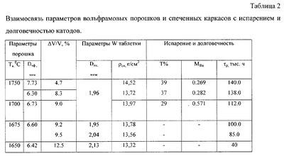 Из таблицы 1 видно, что при Р 0,45 кг/см2 порошок имеет средний диаметр частиц Dчф более 5,5 мкм, усадку W таблеток при спекании менее 11,7% и приемлем для изготовления рабочих таблеток для катодов с высоким процентом выхода годных, имеющих стабильные параметры. При значениях Dчф более 8,0 мкм происходит торможение процесса спекания вольфрамового пористого тела, так как размер Dчф, равный 8,0 мкм, является критическим размером вольфрамового порошка [В.В.Скорохода, О.И.Гетьман, А.Е.Зуева и С.П.Ракитина «Порошковая металлургия», 1988 г., №12, с.24-31]. Однако, как видно из таблицы 2, даже при использовании вольфрамового порошка после трех ступеней отжига с температурой последнего отжига 1700°С, катоды из него более способны (почти в 2 раза) к испарению продуктов с них, чем катоды из порошков, отожженных при 1750°С.