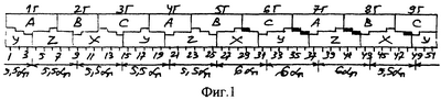 На фиг.1 показана развертка пазовых слоев предлагаемой обмотки при с=1, 2р=6, z=51 с номерами 1…51 снизу, 3р=9 группах с номерами 1Г…9Г сверху, чередованиями фазных зон А-В-С верхнего, X-Y-Z нижнего слоев и зачерненные пазы содержат (2-х)wк витков при 2wк витках в остальных пазах, а снизу размечены сдвиги осей групп, на фиг.2 построена диаграмма сдвигов групп, их ЭДС фаз ЕА, ЕВ. ЕС, относительно оси симметрии 2Г; на фиг.3, 4 по треугольной сетке построены многоугольники МДС обмотки для катушек равно – фиг.3 и не равновитковых фиг.4. Обмотка фиг.1 соединяется при последовательно-согласном включении групп: 1Г, 4Г, 7Г в фазе I, 2Г, 5Г, 8Г в фазе II, 3Г, 6Г, 9Г в фазе III c началами из 1Г, 2Г, 3Г; фазы могут сопрягаться в Y и . При с=2, 3,… обмотка имеет 2р=6с=12, 18,… полюсов, z=51 с=102, 153,… пазов и 3рс=18, 27,… групп.