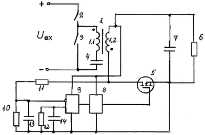 За счет поочередного включения ключевых элементов 2 и 3 меняется полярность напряжения на трансформаторе 1. Полярность напряжения на силовых выводах полевого транзистора 5 свидетельствует о направлении проходящего через него тока. Сигнал о переключении полевого транзистора 5 поступает с его силовых выводов. Изменение направления тока приводит к изменению полярности напряжения на полевом транзисторе 5, что является сигналом для схемы управления этим транзистором.