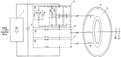 Подается напряжение на входной силовой выпрямитель 1, его напряжением заряжается емкостной фильтр 2 и конденсаторы 8 инверторов 5, 6, 7. Равномерность напряжений инверторов выполняется резисторами 9 и стабиловольтами 10. Затем синхронно подается управление на инверторы 5, 6, 7, которые одинаковыми токами запитывают соответствующие трехфазные катушечные группы 3(1-N) приводного электродвигателя 4. Во всех фазах инверторов 5, 6, 7 и двигателя 4 формируются одинаковые по величине и с соответствующим сдвигом по фазе токи и двигатель работает так же, как и при питании этих обмоток в высоковольтном варианте.