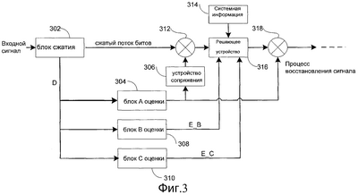 Фиг.3 изображает структурную схему показанного на фиг.2 блока БПП, а именно предложенную схему БПП. Блок включает в себя блок сжатия, три блока А, В и С контрольной оценки, первое множительное устройство, устройство сопряжения, решающее устройство и второе множительное устройство. Блок сжатия сжимает входной сигнал и выделяет полезный сигнал пользователя из полного сигнала. С одной стороны, сжатый сигнал посылается в три блока контрольной оценки; с другой стороны, сжатый поток битов посылается в первое множительное устройство. Выходной сигнал блока А контрольной оценки транспонируется устройством сопряжения; первое множительное устройство умножает сжатый поток битов на сигнал, транспонированный через устройство сопряжения; решающее устройство использует выходные сигналы блоков В и С контрольной оценки и информацию, полученную из системы, для принятия решения по потоку битов, выходящему из первого множительного устройства. Второе множительное устройство умножает сигнал, выдаваемый устройством принятия решения, на сигнал на выходе блока А контрольной оценки. Результат умножения – это входной сигнал модуля демодулятора следующей ступени.