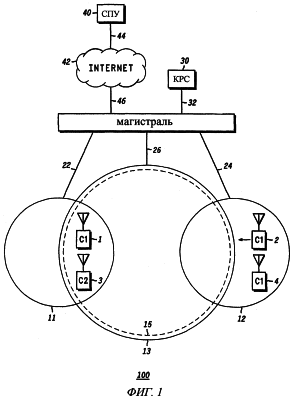Каждая из сотовых сетей 11, 12 связи и радиовещательная сеть 13 подключены к объекту-магистрали, в этом примере – к магистрали, соответствующей протоколу Ipv6, с помощью линий связи, обозначенных соответственно позициями 22, 24 и 26. Первое устройство контроллера, в этом примере – комбинированный радиосервер (КРС, CRS), обозначенный позицией 30, подключено к магистрали 20 с помощью линии 32 связи. Кроме того, второе устройство контроллера, в этом примере – сервер поставщика услуг (СПУ, SPS), обозначенный позицией 40, подключено через сеть Internet, обозначенную позицией 42, к магистрали 20 с помощью линий 44 и 46 связи.