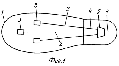 Подошва 1 (фиг.1) выполнена с канавками 2 и углублениями 3. Каблук изготовлен с отверстием 4 и полостью 5.