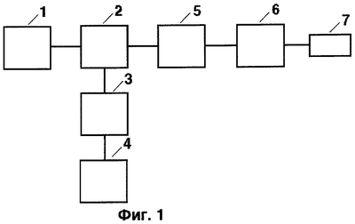 На чертеже (фиг.1) обозначены: 1 – высокочастотный генератор несущей частоты, 2 – импульсный модулятор, 3 – амплитудно-частотный преобразователь, 4 – блок воспроизведения фонограммы, 5 – аттенюатор, 6 – воздействующий элемент, выполненный в виде пьезоэлектрического преобразователя, помещенного в акустически прозрачном корпусе, форма (плоскостная, цилиндрическая и др.) и размеры которого могут варьировать с учетом применяемых методик лечения.