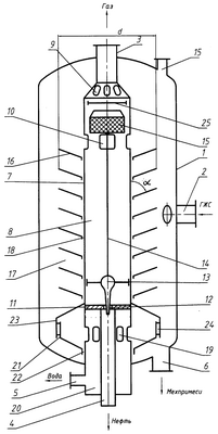 Газ, отделившийся от нефти и воды в процессе сепарации в области пониженного давления, выводится через перепускные окна 9 и далее по патрубку 3.