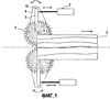 Перемещение части дерева происходит вправо, а распиливаемая часть 2 дерева проходит блок дискового полотна, как показано на фиг.1. Соединительный рычаг 4 направляющей для дискового полотна соединен шарнирно концентрически с валом 6 дискового полотна, например с концом 11 корпуса шарнира в приводном двигателе 8 дисковой пилы. Соседние дисковые полотна 1 пилы, которые находятся на их валу 6 в осевом направлении, то есть, в направлении уровня, показанного на чертеже, могут свободно перемещаться, но, поскольку вал 6 имеет резьбу, им сообщается вращающий момент посредством резьбы вала 6. Резьба вала 6 не была обозначена на чертеже, но длина резьбы достаточна для дисковых полотен 1 пилы, которых может быть несколько, расположенных рядом на одном и том же валу для передачи им вращающего момента от вала 6.