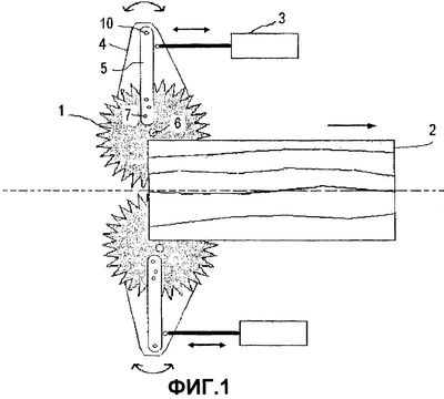 Распиливаемая часть, наружные части которой будут отпилены, обозначена на фиг.2 ссылочной позицией 2. Согласно чертежу, дисковые полотна 1 пилы управляются направляющими для дискового полотна, при этом направляющие для дискового полотна присоединены так, что они находятся на двух боковых сторонах дисковых полотен 1 пилы. Направляющие 5 для дискового полотна соединены шарнирно или соответствующим способом с соединительной частью 9, которая присоединена к соединительному рычажному блоку 4. Направляющие для дискового полотна могут перемещаться вправо или влево, если требуется, потому что они могут перемещаться в соединительную часть 9, а направляющие для дискового полотна могут блокироваться в заданном положении при помощи соединительного винта или соответствующего соединительного элемента 10. При перемещении направляющих 5 для дискового полотна в горизонтальном направлении дисковые полотна 1 пилы также могут перемещаться в горизонтальном направлении влево или вправо, потому что приводной вал 6 имеет резьбу, вдоль которой дисковые полотна пилы могут перемещаться, и дисковым полотнам пилы сообщается вращательный момент от резьбы на валу (на чертеже резьба не показана). Соединительный рычаг 4 шарнирно прикреплен к концу 11 корпуса подшипника в приводном двигателе. Соединительный рычаг прикреплен к концу корпуса подшипника в приводном двигателе так, что он расположен концентрично с приводным валом 6.