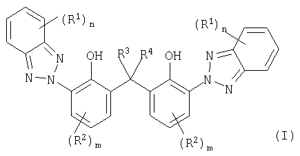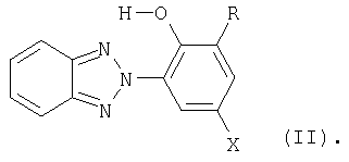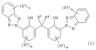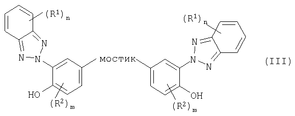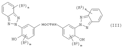 Настоящее изобретение касается композиций, содержащих термопластичные полимеры и бензотриазолы в качестве поглотителей ультрафиолетового излучения (УФ-абсорберов), а также изделий, получаемых из этих композиций. Под изделиями согласно изобретению предпочтительно подразумевают однослойные или многослойные листы, один или оба наружных слоя которых состоят из композиций согласно изобретению. Известны листы, содержащие термопластичные полимеры. Например, из европейской заявки на патент ЕР-А 0110221 известны листы из поликарбоната, предназначенные для использования в самых разнообразных областях, которые получают, например, путем экструзии содержащих поликарбонат композиций и, при необходимости, соэкструзии с содержащими поликарбонат композициями, в состав которых входит повышенное количество УФ-абсорберов. В европейских заявках на патент ЕР-А 0320632 и ЕР-А 0247480 описаны получаемые соэкструзией листы из содержащих поликарбонат композиций, в состав которых входит труднолетучий УФ-абсорбер на основе замещенного бензотриазола. В соответствии с немецкой заявкой на патент DE-A 1670951 предпочтительным является использование в составе поликарбоната димерных бензотриазолов, поскольку они обладают гораздо более низкой летучестью по сравнению с мономерными триазолами. Одной из проблем, возникающих при изготовлении указанных листов путем экструзии, является осаждение легколетучих составных частей композиций, содержащих поликарбонат или в общем случае содержащих термопластичные полимеры, на калибрующем устройстве (при изготовлении ребристых листов) или валках каландра (при изготовлении монолитных листов), что может привести к образованию поверхностных дефектов. Такими легколетучими компонентами являются, например, УФ-абсорберы и другие низкомолекулярные составные части композиций. Недостатком листов согласно уровню техники является то, что при повышенной продолжительности экструзии указанные выше составные части композиций, улетучивающиеся из соответствующих, содержащих поликарбонат или в общем случае содержащих термопластичные полимеры расплавов, оказывают отрицательное воздействие на качество поверхности листов, особенно получаемых путем соэкструзии. Интенсивное испарение УФ-абсорбера из расплавов композиций, содержащих поликарбонат или в общем случае содержащих термопластичные полимеры, приводит к образованию на калибрующем устройстве или валках каландра отложений, вследствие чего на поверхности листов появляются дефекты, например, в виде белых пятен, волнистости и прочее. Кроме того, истирание поликарбоната или используемых в общем случае термопластичных полимеров в калибрующем устройстве приводит к появлению порошкообразных отложений на поверхности листов, изготовляемых из поликарбоната или термопластичных полимеров путем соэкструзии. В связи с этим в основу настоящего изобретения положена задача таким образом оптимизировать композиции, содержащие термопластичные полимеры, чтобы поверхность листов, получаемых из них путем экструзии, обладала хорошим качеством, в том числе и при увеличенной продолжительности непрерывно осуществляемой экструзии, с одновременным сохранением необходимой защищенности листов от воздействия УФ-излучения. Кроме того, задача настоящего изобретения состояла в с