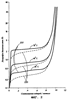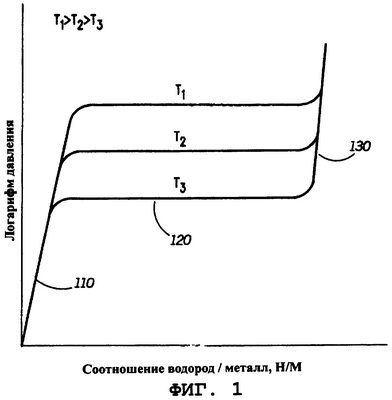 фиг.1 изображает диаграммы идеальной зависимости между давлением, составом и температурой во время поглощения водорода гидридом металла;
