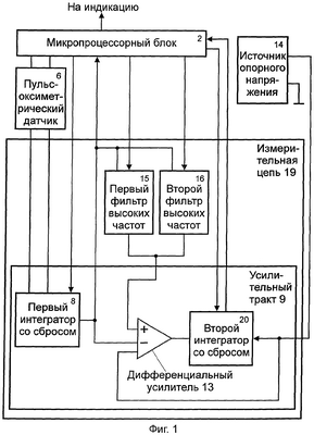 В состав рассматриваемого устройства для измерения уровня оксигенации и частоты пульса входит также источник 14 опорного напряжения и измерительная цепь 19. В состав измерительной цепи 19 входят первый 15 и второй 16 фильтры высоких частот и усилительный тракт 9, выполненный в виде последовательно соединенных первого интегратора 8 со сбросом, дифференциального усилителя 13 и второго интегратора 20 со сбросом.