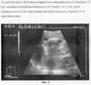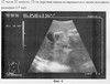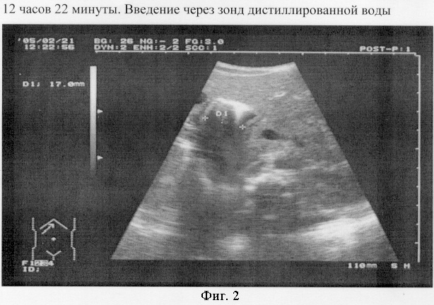 На 4 сутки раннего послеоперационного периода проведена водно-эвакуационная желудочная проба. Больной находился в возвышенном положении 20°. После обзорной УЗИ-графии органов брюшной полости ультразвуковой датчик частотой 5 МГц был установлен в эпигастральной области. Затем через полиуретановый желудочный зонд медленно (со скоростью 10 мл в минуту) в желудок введено 20 мл дистиллированной воды, температурой 25°С. Зафиксировано время окончания введения (12 ч 30 м). Затем в режиме УЗ-наблюдения определено время начала эвакуации тестовой жидкости из просвета желудка в просвет 12-перстной кишки (фиг. 5). Заключение: Эвакуация наступила на 13 минуте (начальное время исследования 12:30). Водно-эвакуационная проба положительная. Энтеральное питание проводить можно.