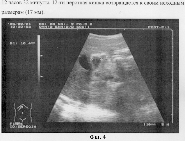 12 часов 30 минут. На 9 минуте происходит эвакуация воды из желудка в 12 п/к, луковица которой растягивается в этот момент до 25 мм, затем сокращается до 10 мм, проталкивая тестовую жидкость в просвет 12-перстной кишки (фиг. 3).