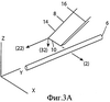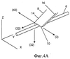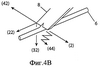 Еще один способ вырезания зазубрин показан на фиг.4А-С. Согласно этому способу зазубрины вырезают путем смещения лезвия, обладающего тремя степенями свободы по подвижности и пространственно-плоскостной геометрией, назад и вперед или зигзагом (колебания по оси Х комбинируются с движением по оси Z и/или Y), подобно режущему движению пилы. Три степени свободы по подвижности подразумевают движение в трехмерной “X-Y-Z” схеме. На фиг.4А направление (2) соответствует поперечной оси X, направление (22) соответствует направленной вперед оси Y, направление (32) соответствует направленной вниз оси Z и направление 42 соответствует поперечной оси X, только в направлении, противоположном направлению (2). Фиг.4А изображает движение, которое можно использовать для выполнения разреза лезвием 8 в направлениях (22) и (32) с чередованием движения между направлениями (2) и (42). Кромка 10 лезвия 8 проходит под прямым углом между краями его сторон 14, 16.