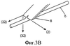 Фиг.3А показывает последовательное режущее движение еще одного лезвия, обладающего тремя степенями свободы по подвижности и имеющего кромку 10 с углом не более 90°. Три степени свободы по подвижности подразумевают движение в трех направлениях трехмерной “X-Y-Z” схемы. Для фиг.3А направление (2) соответствует поперечной оси X, направление (22) соответствует направленной вперед оси Y, а направление (32) соответствует направленной вниз оси Z. Для осуществления вырезания зазубрины в нити 6 можно использовать движение лезвия 8 во всех трех направлениях (2), (22) и (32).