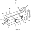 Специалисту в данной области техники очевидно, что конфигурацию зажимного приспособления 63 установки для резания можно изменять. Если нить поворачивают (например, на 120° или 180°) для осуществления вырезания зазубрин по ее окружности, то зажимное приспособление установки для резания может иметь конфигурацию, показанную на фиг.6. Если нить до надрезания скручивают, как показано далее, то зажимное приспособление 63 установки для резания в предпочтительном случае имеет конфигурацию с трапецеидальными сторонами, как показано на фиг.7. Поскольку материал нити является достаточно податливым, эта конструкция обеспечивает прекрасное закрепление в зажимном приспособлении с параллельными сторонами. Заметим, что показанное на фиг.7 зажимное приспособление можно также использовать с повернутой нитью, поскольку в нем имеется место для размещения вырезанной зазубрины. В этой связи, показанные на фиг.7 блоки 68, 74, начиная от вершин своих внутренних сторон, сужаются к внешней стороне к поверхности 76, при этом указанные блоки при взгляде на них с торца имеют трапецеидальный профиль. От сужающейся части блока 68 отходит трапецеидальный или выполненный в виде наковальни зажим 78 для нити, который используется для закрепления нити 6 во время смыкания зажимного приспособления 63 установки для резания. Зажим 78 для нити имеет форму клина, он располагается на поверхности 76 и заканчивается немного ниже верхней стороны 80.